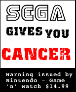 1981 saw Sega changing direction once again. This time a portable pocket-sized machine called the Game and Go! which was obviously based on Nintendo's popular Game 'n' Watch toys. Sega had the innovative idea of making removable battery packs which could be recharged whenever needed (the first ever rechargable battery), but the chemical used in the recharging process was linked to cancer and birth defects, and shortly after the machine's launch the batteries were banned by the United Nations Health Council. Even though Sega countered the problem by releasing a mains power adaptor, the damage had been done, and Nintendo's much-criticised simple but effective 1982 advertising campaign "Sega gives you cancer" (pictured) put the final nails into the Game and Go!'s coffin (and started the Sega/Nintendo rivalry), and Sega returned to their core fruit machine business.