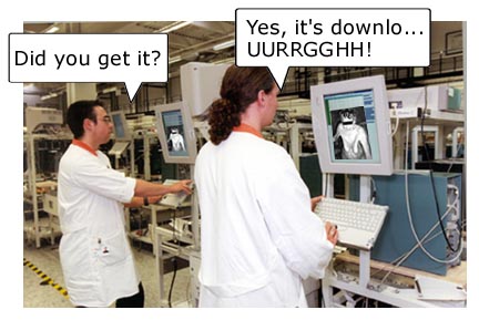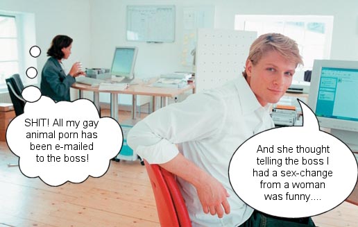 Best by far is this Fujitsu-Siemens promotional photo archive piece of fun sent in by Simon Peckmore and his anonymous friend. See the amount of time he's put into this? Thought bubbles don't just create themselves in Photoshop, you know. It's also quite funny. "Well done", we said to Simon a few days ago via email. We hope he got it -- Excite mail doesn't seem to be working very well. Secondly, we recieived an email containing this link from reader Chris Mayer. It seems to be more of a "web site" than an article, but here it is anyway. It seems to be a series of cases of mistaken identity involving the word "eggs" instead of the letter "x". Obviously a lot of work has gone into it. You've always got to admire that. Thirdly... not really a submission,
