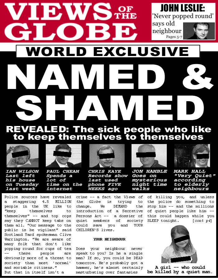 on behalf of people who keep themselves to themselves We say ENOUGH! Please sign our campaign on behalf of people who keep themselves to themselves, which could help turn the tide of hateful opression against those who speak rarely. It could put an end to headlines like this: |