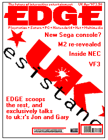 What should we do with it? We've decided not to do any tips & cheats stuff (too dull and difficult), but we're open to other suggestions. Send us your 'new feature' ideas, and the best idea will be used, and the winner may also be sent a UK:Resistance T-Shirt of their choice. Gary:28/03/97Saddam: I was sent on an official resistance mission today to my local arcades and was pleased to find Model 3 racer Scud Race had arrived. Yes, I did say Scud Race. Seems like the forecast name change to Super GT didn't happen. Still, it's an excellent game and there was plenty of interest from the other arcade goers. The Model 3 visuals are Very fast and smooth and the detail level of the trackside scenery is amazing. Another notable new release is Wave Runner, Sega's Jet Bike game. It features a moving 'Bike' and for added realism some guy throws water all over you. Not really. Anyway it looked pretty average to me. Jon 27-03-97