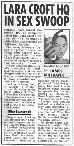 If proof were needed that Tomb Raider was developed by perverts for perverts, British tabloid newspaper 'The News of the World' has published this shameful story about the deviant nature of a key Tomb Raider programmer, Kenneth Lockley, who apparently has a thing for nine year old girls. This genuine report appeared in Sunday's paper:"New" Employee added Gold dust: A story that's like Christmas and birthday rolled into one for UK:R